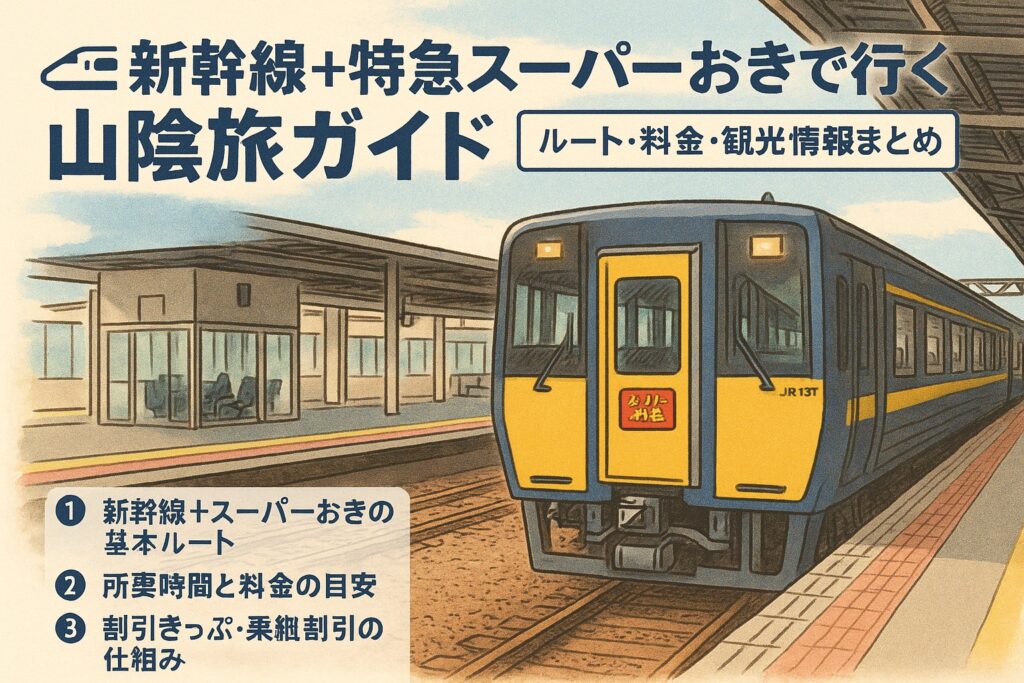 🚄 新幹線+特急スーパーおきで行く山陰旅ガイド|ルート・料金・観光情報まとめ 「静かな山あいに流れる時間」「歴史が息づく街並み」――。 そんな“日本の原風景”に出会える山陰への旅は、新幹線と特急スーパーおきの乗り継ぎで叶います。 新山口を起点に...